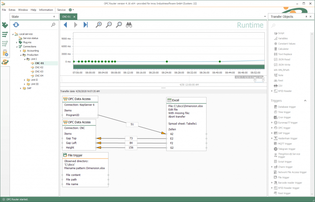 使用 OPC Router通過拖放將您的系統(tǒng)連接到 Microsoft Excel非常簡單和直觀。屏幕截圖顯示了 OPC Router和 Microsoft Excel 的應用示例。在第一個屏幕截圖中,OPC UA 數(shù)據(jù)通過 OPC Router寫入 Excel 文檔。然后,在第二個屏幕截圖中,這些數(shù)據(jù)從 Excel 文檔中保存在數(shù)據(jù)庫中,并同時通過電子郵件發(fā)送給其他部門。
