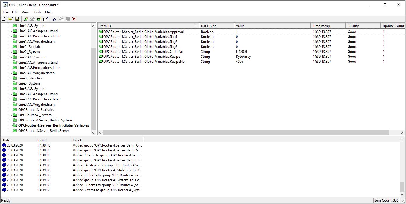 您的 OPC UA Server插件通過拖放與 OPC Router的連接非常簡單和直觀。變量在 OPC Router連接中直接填充數(shù)據(jù),然后可以通過 OPC UA 進(jìn)行查詢。之后,可以通過 OPC UA(通過 Kepware 的 OPC UA 測試客戶端)訪問 OPC Router變量。